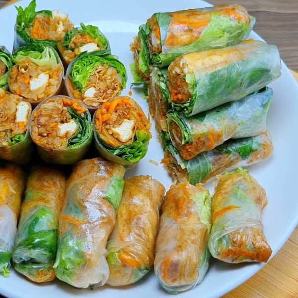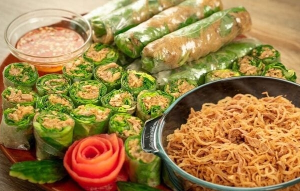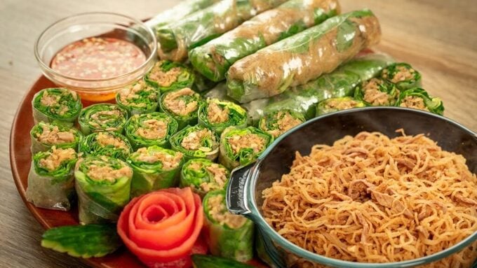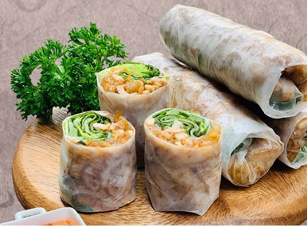 Điểm nhấn đặc biệt là phần bì thính – được làm từ da heo luộc thái sợi mỏng, trộn với thính gạo rang vàng thơm, nêm nếm vừa miệng. Khi cuốn cùng rau và bún, chấm nước mắm chua ngọt hoặc mắm nêm, vị ngon như bùng nổ trong từng miếng ăn.